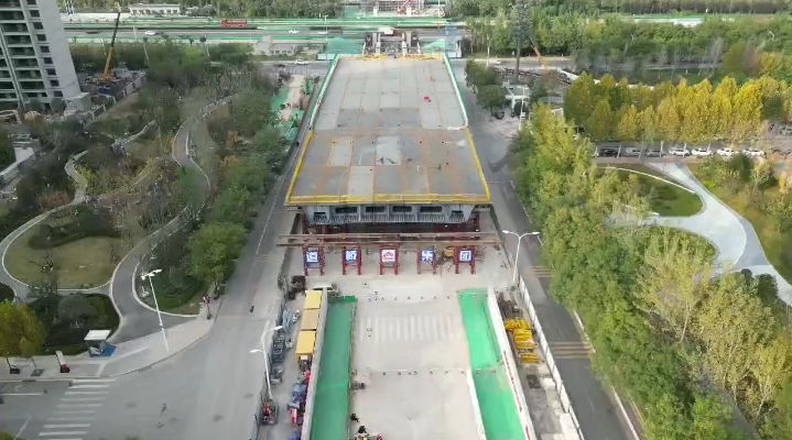 广运潭大道立交工程桥体正在顶推中